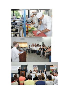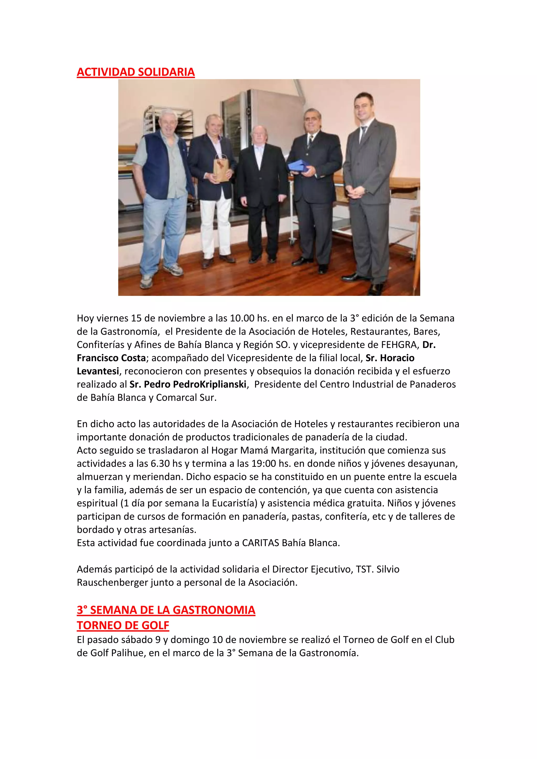 Este documento contiene información sobre varias actividades realizadas como parte de la 3° edición de la Semana de la Gastronomía en Bahía Blanca. Incluye detalles sobre una donación de productos de panadería a un hogar, un torneo de golf, charlas y clases magistrales, un concurso de chefs y una carrera de mozos.
