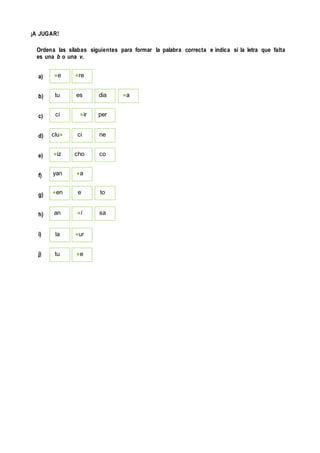 El documento contiene 10 preguntas o actividades relacionadas con las letras b y v. Las preguntas incluyen completar palabras con doble b o doble v, escribir oraciones con ciertos verbos, nombrar objetos y ciudades que comiencen con b o v, y ordenar sílabas para formar palabras.