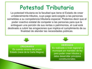Este documento describe los diferentes tipos de potestad tributaria, incluyendo la originaria que emana de la constitución y la derivada que es creada a nivel regional o municipal. También discute los principios de la propiedad tributaria como ser determinada por el poder legislativo y aplicada por el poder ejecutivo. Finalmente, explica las limitaciones a la potestad tributaria como los principios de legalidad, capacidad contributiva, generalidad e igualdad.