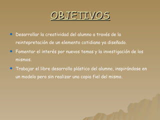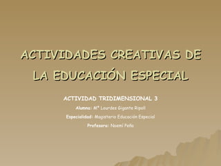 Este documento describe una actividad creativa realizada por una estudiante de educación especial. La actividad consistió en investigar el diseño de una silla creada por Koloman Moser en 1902 e inspirada en su diseño, crear una silla tridimensional utilizando materiales de reciclaje como cajas y papeles de colores. Aunque el resultado final no fue el esperado, la estudiante considera que el proceso creativo fue interesante y podría adaptarse para alumnos con necesidades educativas especiales.
