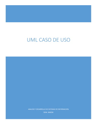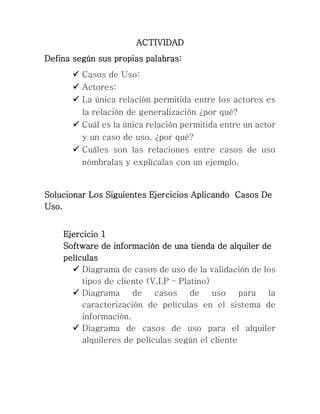 El documento presenta ejercicios para aplicar casos de uso a sistemas de información de una tienda de películas, una biblioteca y un hotel. Incluye instrucciones para crear diagramas de casos de uso para validar tipos de clientes, caracterizar películas, alquilar películas, verificar datos, consultar multas, manipular información de usuarios, registrar libros, solicitar préstamos, consultar habitaciones disponibles, modificar información y reservar habitaciones en el hotel.