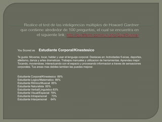 El documento describe los resultados de una evaluación de estilos de aprendizaje que identificó al estudiante como principalmente Corporal/Kinestésico, seguido de Lógico/Matemático y Ritmico/Musical. Los estilos identificados indican que el estudiante aprende mejor a través del movimiento, tocando objetos y procesando información a través de sensaciones corporales.