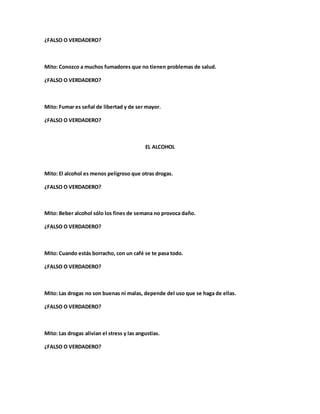 Este documento presenta varios mitos comunes sobre sustancias psicoactivas como la marihuana, el tabaco y el alcohol, y pregunta al lector si cada mito es verdadero o falso. Los mitos sobre la marihuana incluyen que no es dañina porque proviene de una planta natural, que cura el cáncer y que está bien fumarla ocasionalmente. Los mitos sobre el tabaco son que tranquiliza, que muchos fumadores no tienen problemas de salud y que fumar representa libertad. Los mitos sobre el alcohol son que es menos peligro