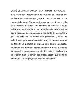 El documento discute lo que un observador debe observar durante la primera jornada de clases. Señala que los estudiantes disfrutarán más de las materias si el maestro explica bien los conceptos, responde dudas y mantiene una buena relación con los estudiantes. También analiza las actitudes de los estudiantes hacia diferentes asignaturas, amigos y tareas escolares.