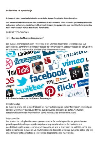 Este documento describe las nuevas tecnologías y su aplicación en la educación. Explica las características de las nuevas tecnologías como la inmaterialidad, interconexión y capacidad de almacenamiento. También describe cómo Internet y las herramientas de la Web 2.0 como blogs, wikis y redes sociales pueden usarse como herramientas educativas para apoyar el aprendizaje colaborativo. El documento proporciona ejemplos de cómo integrar las tecnologías en la planificación de actividades educativas.