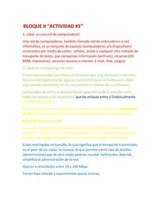 El documento describe diferentes tipos de redes de computadoras, incluyendo LAN (redes de área local), MAN (redes de área metropolitana), y WAN (redes de área amplia). También describe las principales topologías de red, como malla, estrella, anillo, árbol y bus. Explica las características clave de cada tipo de red y topología.