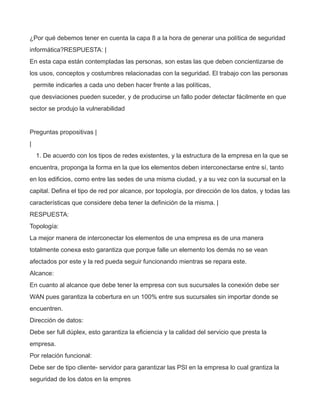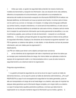 1. El documento explica que los gestores de seguridad deben entender los modelos de transmisión y recepción de información e ilustrarlos a los empleados usando ejemplos cotidianos como llamadas telefónicas. 2. Aclara que las políticas de seguridad informática no mejoran el rendimiento de los sistemas pero son vitales para proteger los datos de la organización. 3. Pregunta por qué la gestión principal de seguridad se da en la capa 4 técnicamente y en la capa 8 administrativamente.