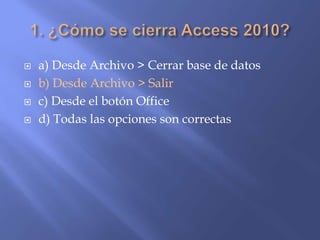 Este documento contiene preguntas y respuestas sobre cómo cerrar una base de datos, salir de Access, usar la cinta de opciones, usar atajos de teclado y obtener ayuda en Access. Ofrece información sobre diferentes partes de la interfaz como la barra de estado, la cinta de opciones y cómo interactuar con ellas.
