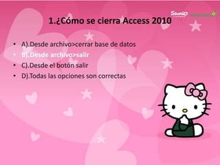 Este documento contiene 10 preguntas sobre cómo usar las funciones básicas de Access 2010. Las preguntas cubren cómo cerrar Access 2010, usar la cinta de opciones, ocultar y mostrar la cinta, y acceder a la ayuda del programa. La mayoría de las acciones como cerrar, minimizar y maximizar una base de datos se realizan a través de la cinta de opciones o combinaciones de teclas.