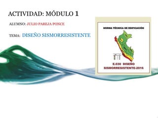 El documento describe las actividades realizadas por Julio Pareja Ponce en el Módulo 1 sobre diseño sismorresistente. Estas actividades incluyen diferentes tipos de búsquedas en línea como búsquedas de frases exactas, con restricciones de palabras, por rangos, de definiciones y en diferentes formatos como PDF y PPT, así como en sitios oficiales y gubernamentales.