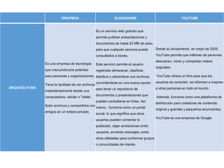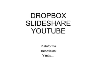 Dropbox, SlideShare y YouTube son plataformas para almacenar y compartir archivos y videos. Dropbox permite almacenar archivos en la nube y acceder a ellos desde cualquier dispositivo. SlideShare es para compartir presentaciones y documentos públicamente. YouTube es principalmente para ver y compartir videos, pero también permite almacenar y encontrar otros tipos de contenido como música y tutoriales.
