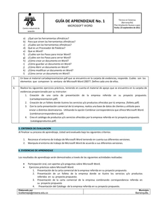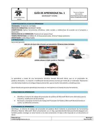 Este documento presenta una guía de aprendizaje para enseñar el uso de Microsoft Word a aprendices. La guía incluye introducción al software, resultados de aprendizaje, actividades prácticas, criterios de evaluación y evidencias de aprendizaje. Los aprendices aprenderán a identificar las herramientas de Word y manipular su entorno de trabajo a través de ejercicios como crear una carta comercial, folleto, base de datos de clientes y catálogo de productos para una empresa hipotética.