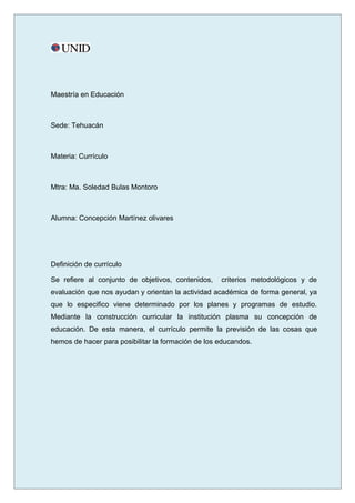 Este documento presenta información sobre un curso de maestría en educación en la ciudad de Tehuacán, México. Se enfoca en el tema de currículo y provee una definición de currículo, así como un cuadro comparativo de diferentes conceptos de currículo como silabo, tabla de contenido, libro de texto, plan de estudios y experiencias planeadas. Además, discute la importancia de cinco tipos de currículos y cómo la contextualización de los planes y programas de estudios permite el buen funcionamiento de los currículos.