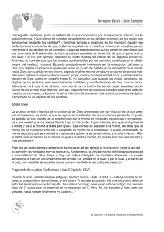 Este documento presenta información sobre las filosofías de San Agustín de Hipona y Santo Tomás de Aquino. Resume las biografías de ambos pensadores, sus ideas sobre la existencia de Dios, el conocimiento y el tiempo. También incluye extractos de sus obras principales como Las Confesiones y La Suma Teológica. Finalmente, pide a los estudiantes que completen un cuadro comparativo destacando los argumentos de cada uno sobre la existencia de Dios.