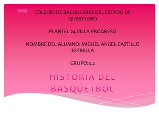 El documento resume la historia del baloncesto desde su creación por James Naismith en 1891 hasta la formación de las principales ligas profesionales. Naismith creó el baloncesto para ser un deporte fácil de jugar que no fuera agresivo. El primer partido oficial se jugó en 1892 y el baloncesto se difundió rápidamente en Estados Unidos y el mundo. En los años 1940 surgió la NBA para entretener al público durante el descanso invernal de la liga de hockey, consolidándose como la mejor liga de baloncesto del mundo en las dé