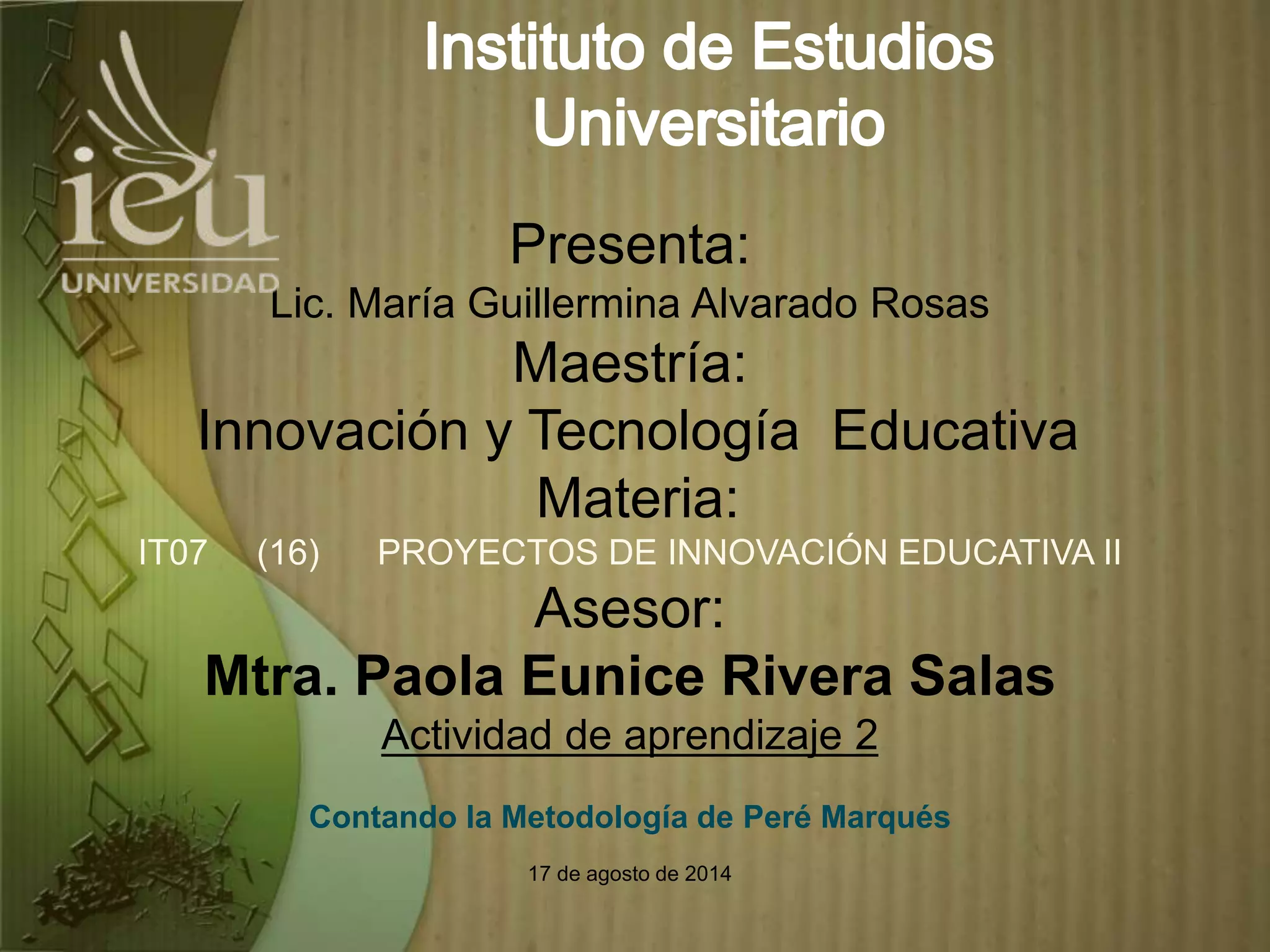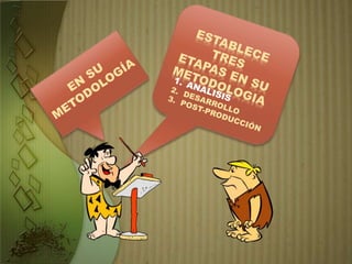 El documento presenta la metodología de Peré Marqués para el desarrollo de software educativo. La metodología consta de tres etapas principales: 1) análisis, donde se justifica el proyecto, se definen los objetivos y contenidos; 2) desarrollo, que incluye la creación del guión multimedia, prototipos alfa y beta, y evaluaciones; y 3) post-producción, con edición, distribución y mantenimiento del producto final. El enfoque considera elementos como equipo de diseño, instrumentos, presentación, contenidos