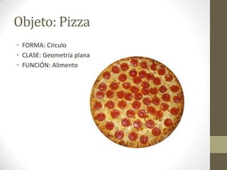 El documento presenta un catálogo de objetos geométricos cotidianos como una pizza, naranja, señal de tráfico y cuadro, describiendo la forma, clase y función de cada uno. Se clasifican las formas geométricas como planas o espaciales y se enumeran 20 objetos en total.