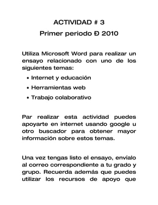 La actividad #3 del primer periodo de 2010 solicita que los estudiantes escriban un ensayo en Microsoft Word sobre uno de los siguientes temas: Internet y educación, herramientas web o trabajo colaborativo. Los estudiantes deben investigar el tema en Internet y luego enviar el ensayo por correo electrónico a su grado y grupo. El ensayo debe contener el análisis e opiniones propias del estudiante, en lugar de solo copiar y pegar de Internet.