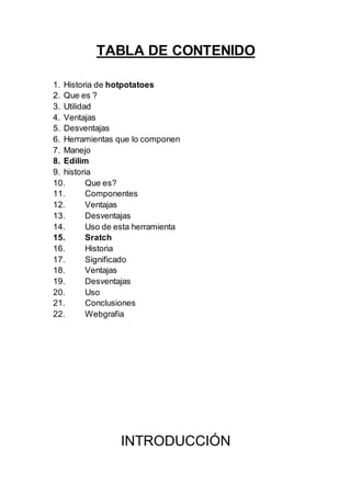 Este documento presenta tres herramientas educativas interactivas: Hotpotatoes, que permite crear ejercicios interactivos como crucigramas y cuestionarios; Edilim, un editor de actividades para crear libros interactivos; y Scratch, una herramienta para que los niños aprendan conceptos de programación de una manera sencilla y divertida mediante la creación de historias y juegos interactivos.