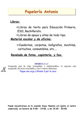 La papelería Antonio ofrece libros de texto y materiales escolares para estudiantes de primaria, secundaria y bachillerato, así como artículos de oficina. También proporciona servicios de revelado de fotos, copias y fax. Actualmente tienen una oferta especial de 3 cajas de clips por el precio de una.
