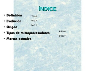 El microprocesador es la parte central de una computadora que ejecuta instrucciones y lleva a cabo operaciones lógicas simples. Los microprocesadores han evolucionado desde su creación por Intel en 1971, con marcas como AMD compitiendo en el mercado. Existen diferentes tipos de microprocesadores que varían en características como el número de núcleos, memoria caché y velocidad.