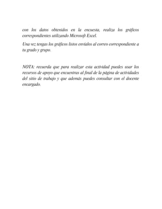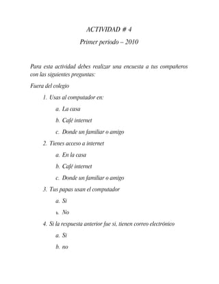 La actividad #4 solicita que los estudiantes realicen una encuesta a sus compañeros con 4 preguntas sobre el uso de computadoras y acceso a Internet fuera de la escuela. Luego, los estudiantes deben crear gráficos en Microsoft Excel con los datos de la encuesta y enviarlos por correo electrónico a su profesor. La actividad también indica recursos de apoyo disponibles para completarla.