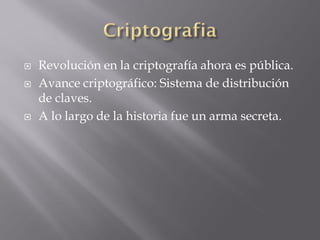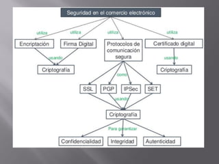 El documento habla sobre la infraestructura de clave pública (PKI) y cómo permite el intercambio seguro de información en Internet. La PKI se basa en el sistema RSA de distribución de claves y usa certificados digitales, organizaciones de certificación y directorios de certificados para proporcionar autenticación, integridad, no repudio y otras funciones de seguridad.