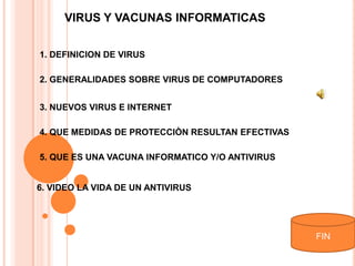 El documento habla sobre virus y vacunas informáticas. Explica que los virus son programas que se replican a sí mismos e interfieren con el hardware o software de una computadora, y que las vacunas informáticas son programas antivirus que detectan y eliminan virus para proteger las computadoras. También discute cómo los nuevos virus se propagan a través de Internet y las medidas efectivas de protección como mantener los antivirus actualizados.