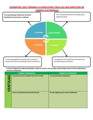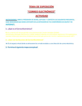 Este documento proporciona instrucciones para completar una exposición sobre correo electrónico. Incluye preguntas sobre la definición de correo electrónico, buzones de correo, proveedores de correo y características de contraseñas seguras. El estudiante debe completar mapas conceptuales y cuadros comparativos, y proporcionar ejemplos de contraseñas seguras e inseguras.