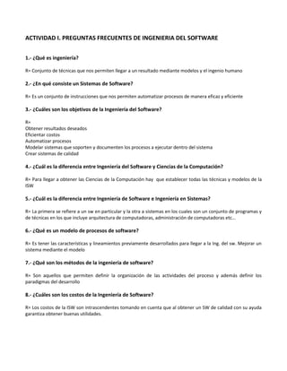 El documento presenta dos actividades para evaluar la materia de ingeniería de software. La primera actividad consiste en 10 preguntas frecuentes sobre ingeniería de software, con sus respectivas respuestas. La segunda actividad trata sobre la calidad en el desarrollo de software y contiene 6 temas relacionados con conceptos básicos de calidad, sistemas de gestión de calidad, certificaciones y la historia de la calidad.