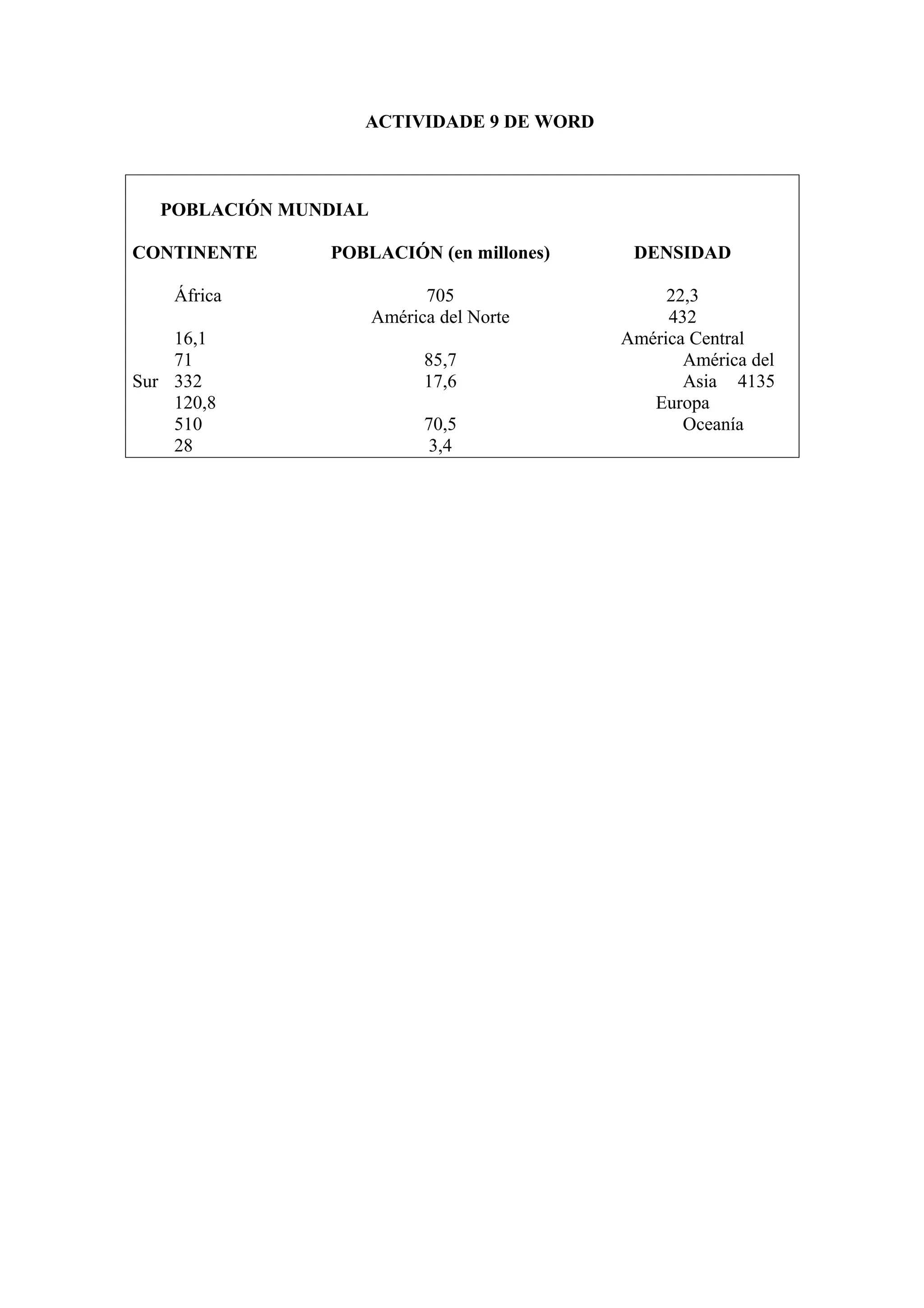 El documento proporciona información sobre la población mundial por continente. Muestra que Asia tiene la mayor población con 4,135 millones de personas. Le siguen África con 705 millones y Europa con 510 millones. América del Norte tiene la menor población con 16,1 millones. También incluye datos sobre la densidad poblacional por continente.