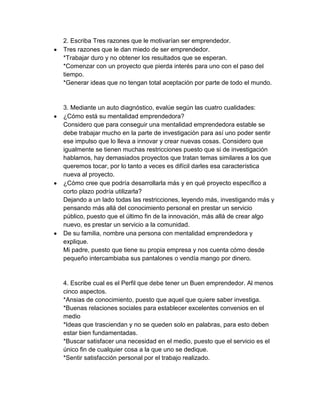 El documento proporciona instrucciones para un trabajo en parejas sobre emprendimiento. Se pide realizar un mapa conceptual con varios términos relacionados, identificar razones para ser o no ser emprendedor, evaluar su propia mentalidad emprendedora, describir las características de un buen emprendedor, leer sobre las competencias de un emprendedor de Jesús María, y presentar en grupo sobre una de las competencias.