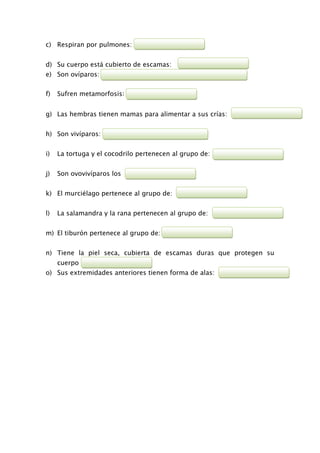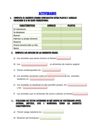 Este documento presenta una serie de actividades relacionadas con la clasificación y características de plantas y animales. Incluye un cuadro comparativo sobre plantas y animales, frases para completar sobre reproducción, alimentación y hábitat de diferentes animales, y preguntas sobre las características distintivas de diferentes grupos de vertebrados como peces, anfibios, reptiles, aves y mamíferos.