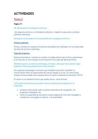Este documento contiene información sobre programas antivirus, cortafuegos, y spyware. Explica que los programas antivirus usan firmas y sistemas heurísticos para detectar software malicioso, y que un cortafuego permite o prohíbe la comunicación entre aplicaciones y la red para evitar ataques. También indica que la presencia de spyware se puede notar por la recopilación de información de navegación y programas instalados, y por redireccionar la página de inicio del navegador.
