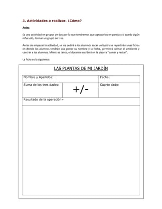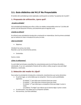 Este documento presenta dos guías didácticas para actividades de matemáticas para niños de 7-8 años. La primera guía describe una actividad usando un come dedos y dados para practicar sumas y restas. La segunda guía describe un concurso de equipos usando diapositivas para evaluar la comprensión de sumas y restas. Ambas actividades tienen el objetivo de practicar sumas y restas de forma motivante y entretenida.