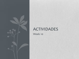Este documento contiene las actividades planeadas para varias semanas de clases de español. Incluye ejercicios diarios como conjugaciones verbales y preguntas para reflexionar, así como proyectos como crear un diario y resumir un artículo de noticias en español. El documento proporciona una lista extensa de verbos y actividades para que los estudiantes practiquen su vocabulario.