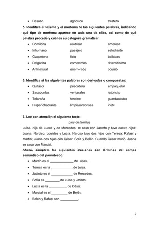 Este documento presenta varias actividades lingüísticas relacionadas con la morfología y la semántica léxica. Incluye ejercicios para completar oraciones usando palabras de la misma familia léxica, separar palabras en monemas, identificar morfemas y categorías gramaticales, y organizar términos en campos semánticos y asociativos. El objetivo es practicar conceptos morfológicos y semánticos a través de ejercicios prácticos.
