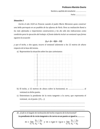 El documento describe dos situaciones relacionadas con conceptos de derivadas. La primera situación describe la construcción de una parroquia en Francia en 1610, donde se especifican condiciones sobre la forma de un ventanal y la inclinación del techo. La segunda situación presenta gráficos de funciones para analizar la existencia de derivadas y tangentes en puntos. Se piden cálculos de pendientes de rectas tangentes y secantes, y se analizan propiedades de funciones derivables.