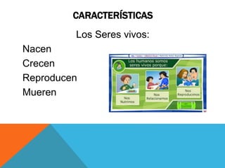 Este documento describe las características de los seres vivos, incluyendo que nacen, crecen, se reproducen y mueren. Además, clasifica a los seres vivos en seis reinos: Monera, Protista, Hongos, Virus, Plantas y Animales. Todos los seres vivos comparten la característica fundamental de poseer vida.