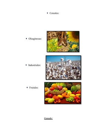 El documento habla sobre la agricultura tradicional y moderna, los principales cultivos como hortalizas, cereales, oleaginosas, industriales y frutales, y las distintas categorías de ganado como bovino, caprino, vacuno, porcino, ovino y equino, distinguiendo entre ganadería intensiva y extensiva. Fue elaborado por Agustina Roque, Daniela Rejala y Aldana Castillo para un trabajo práctico del año 2010.