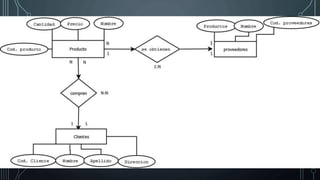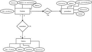 El documento describe tres escenarios que requieren el desarrollo de bases de datos. El primero involucra una empresa que vende productos a clientes, donde se necesita almacenar información de clientes, productos y proveedores. El segundo trata sobre una tienda de computación que vende productos a clientes y trabaja con proveedores. El tercero describe una farmacia que necesita organizar su información de almacén y bodegas, incluyendo datos de anaqueles y medicamentos.