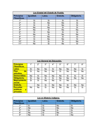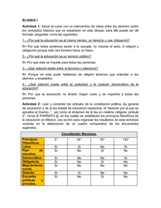 Este documento presenta 8 actividades relacionadas con los principios filosóficos de la educación en México. La primera actividad propone un intercambio de ideas sobre conceptos básicos como la educación como derecho y obligación. Las actividades 2 a 4 implican leer documentos constitucionales y de ley para analizar dichos principios. La actividad 5 consiste en un debate sobre afirmaciones relacionadas con la educación laica. Las actividades 6 y 7 reflexionan sobre la importancia del laicismo y la tolerancia. La actividad 8 toma como referencia un texto sobre la