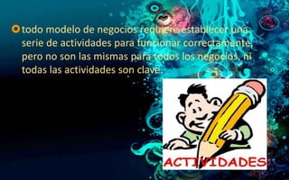 Este documento describe las actividades clave para un modelo de negocios exitoso. Explica que las actividades clave dependen del giro del negocio y cómo genera ingresos. Para un negocio en línea, la seguridad de transacciones y protección de datos son muy importantes. Luego enumera tres actividades clave para el plan de negocio presentado: producción de alta calidad, solución de problemas para clientes insatisfechos, y mantenimiento de una página web actualizada para mostrar nuevos productos.