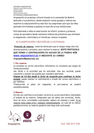 El documento describe una actividad complementaria programada para alumnos de 6o de primaria. Los alumnos visitarán el parque cultural Arqueopinto, dedicado a la prehistoria, donde realizarán talleres didácticos sobre esta época. Se explica el proceso de reserva, los protocolos, precios, horarios y contenidos de la visita. Los profesores informarán a los alumnos y solicitarán la autorización de los padres para la excursión.