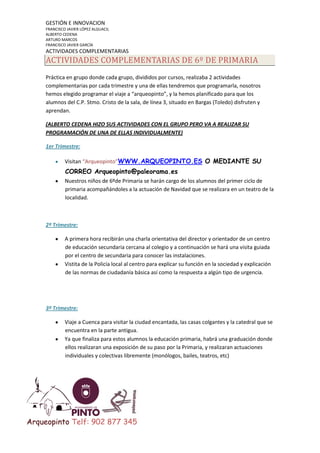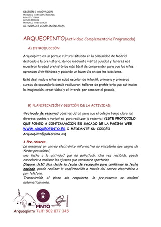 El documento describe una actividad complementaria programada para alumnos de 6o de primaria. La actividad consiste en una visita al parque cultural Arqueopinto situado en la Comunidad de Madrid, dedicado a la prehistoria. Se explican los detalles de la planificación de la actividad como la reserva, el protocolo a seguir, los precios, horarios y cómo llegar a las instalaciones. Los profesores informarán a los alumnos y padres sobre la visita y recibirán la autorización firmada de los padres.