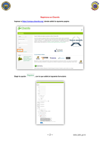 El documento describe el proceso de registro y uso de la plataforma Chamilo tanto para estudiantes como para docentes. Para registrarse, los usuarios deben ingresar a la página web de Chamilo, completar un formulario con sus datos y elegir su rol de estudiante o docente. Una vez registrados, tanto estudiantes como docentes pueden acceder a diferentes funciones como cursos, calendario, foros, glosarios y actividades como ejercicios, tareas y grupos.