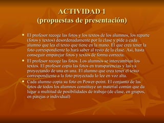 Este documento propone cuatro actividades para mejorar el vocabulario y la comprensión lectora de textos periodísticos en español para estudiantes suecos. La primera actividad implica que los estudiantes encuentren una foto y texto periodístico e intercambien esta información con sus compañeros. Las actividades 2 y 4 implican que los estudiantes identifiquen verbos, sustantivos y su traducción al sueco en noticias seleccionadas. La actividad 3 implica que los estudiantes analicen en grupo el contenido y palabras clave de una