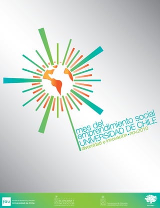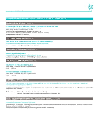 El documento describe un evento de una semana sobre emprendimiento social que incluye conferencias, talleres, foros y una feria, organizado por la Universidad de Chile, con la participación de varias organizaciones sociales y emprendedores.