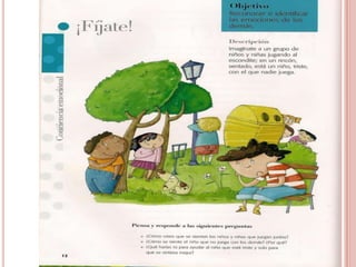 El documento describe varias actividades para trabajar la inteligencia emocional en los alumnos. Incluye actividades como un diccionario de sentimientos, contar cuentos sobre emociones, usar globos de colores para identificar reacciones emocionales, posar con caras que muestran emociones, y trabajar con recuerdos y fotos personales para reflexionar sobre las emociones. El objetivo es que los alumnos aprendan a reconocer y comprender mejor sus propias emociones y las de los demás.
