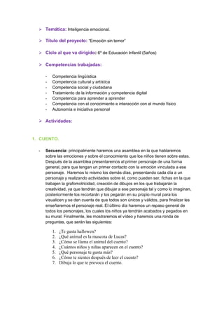 Este documento presenta un proyecto educativo llamado "Emoción sin temor" dirigido a niños de 5 años de Educación Infantil. El proyecto trabaja la inteligencia emocional a través de 7 actividades que incluyen cuentos, juegos de roles, murales y discusiones en grupo. El objetivo es que los niños reconozcan y gestionen sus propias emociones y las de los demás de forma positiva.